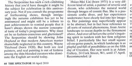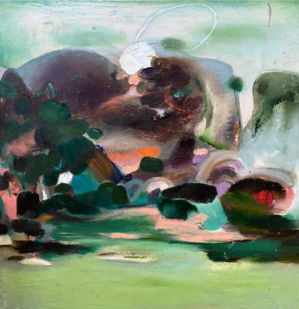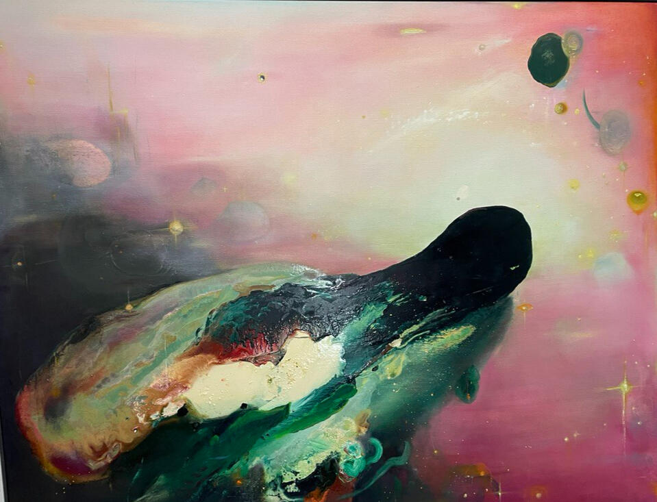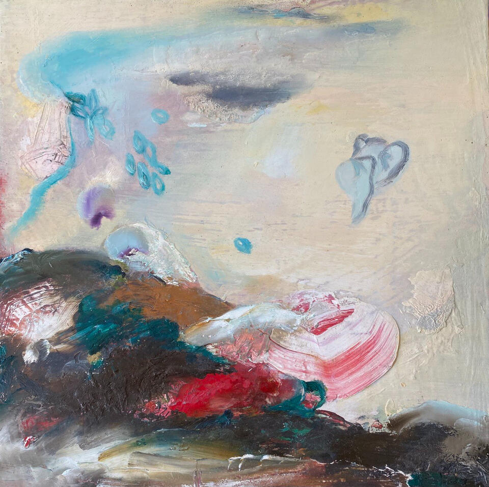 Hsiao-Mei trained first in her native Taiwan, pursuing a general education in art at Fu-Shin School of Arts & Trades in Taipei, the best-known and most prestigious art school in the country. The first two years offered a wide grounding in the visual arts: not only was she taught traditional Chinese art as well as Western modes, but also graphics, pottery, sculpture and design, before being allowed to specialise in the third year.Another point of reference for Hsiao-Mei’s work is The Bible, and in particular ‘The Revelation to John‘. The Bible is not a book you expect to find in the studio of many young artists, but Hsiao-Mei reads it and finds much to interest her therein. The imagery in the Book of Revelations has long excited artists, not least the fabulous beasts with many eyes, and if these are not to be immediately discerned in Hsiao-Mei’s paintings, the richly coloured settings of jasper and cornelian, a rainbow that looks like an emerald and a sea of glass like crystal, do have parallels in her pictures.These paintings are like journeys into the deep space of fantasy, or fording rivers of gems. Hsiao-Mei speaks of the mathematics of painting, of aiming for perfection, but also knowing that all beauty is flawed, not perfect. For her, getting the equation right might be akin to making a leap of faith. She is fascinated by the afterlife and speculates about what it’s like to float on a pink space, lie under a soft cushion of cloud, or whistle up a forest. As she insists: ‘Painting’s about having fun too.’ Her enjoyment of materials and imagery is everywhere apparent. Like a gardener, she likes getting her hands dirty, working with her fingers delicately to smudge marks, or more robustly to join different pours of paint. She does use a variety of brushes, but her approach is determinedly hands-on.Before having children in 2010 when she devoted herself to bringing her boy and girl up, she loved to travel and going diving a lot, in places such as Borneo and Sarawak. The underwater kingdom revealed by snorkeling evidently stimulates the imagery of her work, though her observations of the natural world are of less active importance to her painting than the power of the subconscious. Her reliance on the direction of the imagination owes much to the ‘automatic’ processes of the Surrealists, but she is closer in spirit to a maverick like Tanguy (a great painter of magical landscapes) than that arch stylist Dalí. Among the artists she admires are Milton Avery and Jack B Yeats, Soutine and Marlene Dumas. She is unburdened by preconceptions and can enjoy the startling originality of Lowry’s landscapes without being fazed by his (to many) troublesome reputation for painting matchstick men or being unsophisticatedly demotic. That freshness of thought is evident throughout her work. These new paintings offer many pleasures: aesthetic, emotional, formal. In them we can almost see the celestial music of the spheres.Text by Andrew Lambirth