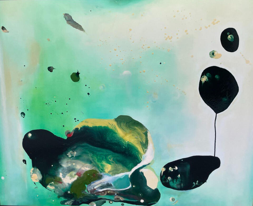 Hsiao-Mei trained first in her native Taiwan, pursuing a general education in art at Fu-Shin School of Arts & Trades in Taipei, the best-known and most prestigious art school in the country. The first two years offered a wide grounding in the visual arts: not only was she taught traditional Chinese art as well as Western modes, but also graphics, pottery, sculpture and design, before being allowed to specialise in the third year.Another point of reference for Hsiao-Mei’s work is The Bible, and in particular ‘The Revelation to John‘. The Bible is not a book you expect to find in the studio of many young artists, but Hsiao-Mei reads it and finds much to interest her therein. The imagery in the Book of Revelations has long excited artists, not least the fabulous beasts with many eyes, and if these are not to be immediately discerned in Hsiao-Mei’s paintings, the richly coloured settings of jasper and cornelian, a rainbow that looks like an emerald and a sea of glass like crystal, do have parallels in her pictures.These paintings are like journeys into the deep space of fantasy, or fording rivers of gems. Hsiao-Mei speaks of the mathematics of painting, of aiming for perfection, but also knowing that all beauty is flawed, not perfect. For her, getting the equation right might be akin to making a leap of faith. She is fascinated by the afterlife and speculates about what it’s like to float on a pink space, lie under a soft cushion of cloud, or whistle up a forest. As she insists: ‘Painting’s about having fun too.’ Her enjoyment of materials and imagery is everywhere apparent. Like a gardener, she likes getting her hands dirty, working with her fingers delicately to smudge marks, or more robustly to join different pours of paint. She does use a variety of brushes, but her approach is determinedly hands-on.Before having children in 2010 when she devoted herself to bringing her boy and girl up, she loved to travel and going diving a lot, in places such as Borneo and Sarawak. The underwater kingdom revealed by snorkeling evidently stimulates the imagery of her work, though her observations of the natural world are of less active importance to her painting than the power of the subconscious. Her reliance on the direction of the imagination owes much to the ‘automatic’ processes of the Surrealists, but she is closer in spirit to a maverick like Tanguy (a great painter of magical landscapes) than that arch stylist Dalí. Among the artists she admires are Milton Avery and Jack B Yeats, Soutine and Marlene Dumas. She is unburdened by preconceptions and can enjoy the startling originality of Lowry’s landscapes without being fazed by his (to many) troublesome reputation for painting matchstick men or being unsophisticatedly demotic. That freshness of thought is evident throughout her work. These new paintings offer many pleasures: aesthetic, emotional, formal. In them we can almost see the celestial music of the spheres.Text by Andrew Lambirth